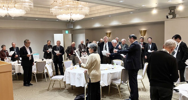 | 恒例の出席者全員の「琵琶湖就航の歌」斉唱でお開きに | 最後は前川尚美顧問が挨拶。 次回総会での再会を期した |
