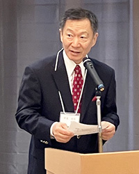 | 今回は「ロイヤルパインズホテル千葉」で開催。ただし場所は例年と同じで名前が違うだけ。迷う方は少なかったのでは | 冒頭には馬場弘二副会長が挨拶。 令和6年度には10名の新入会員があったことに感謝を述べた |