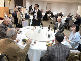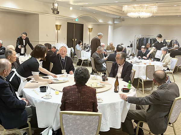 | ふるさと近江の歌が静かに流れる中、各テーブルでは終始和やかな談笑が続いていた |